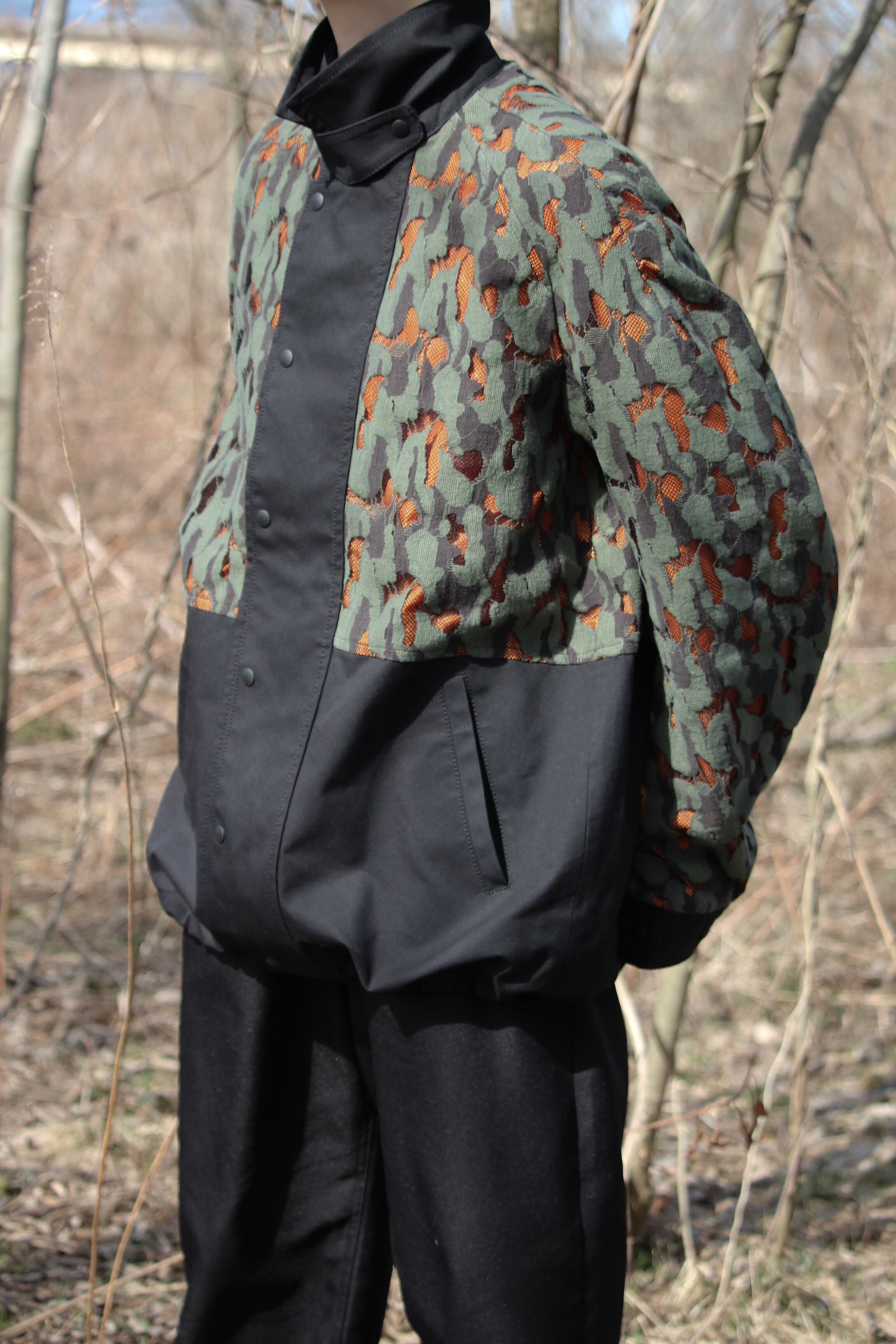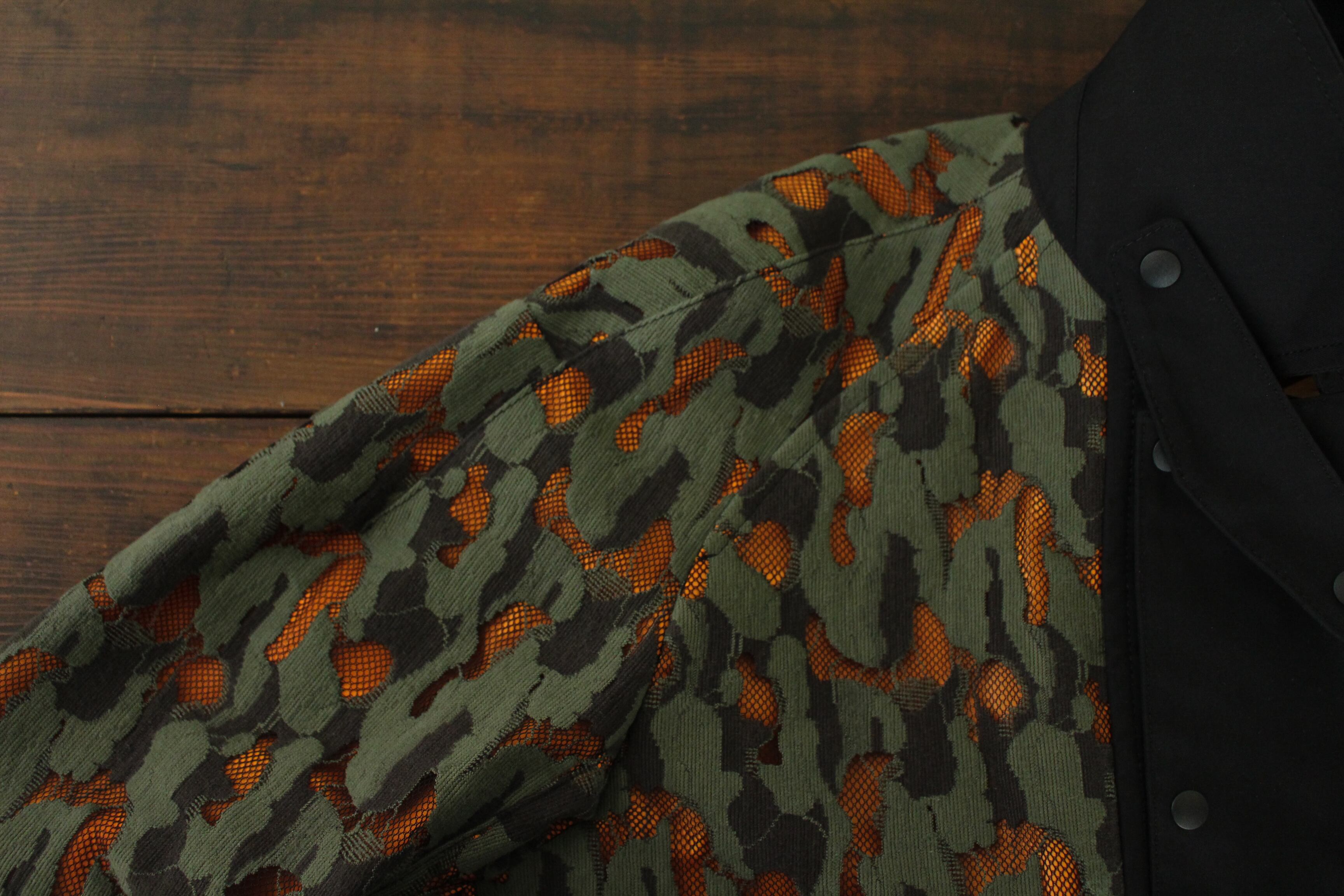 絶版の希少な編機でつくられたカモフラージュのラッセルレースと、ナイロンチノクロスからできたショートブルゾン